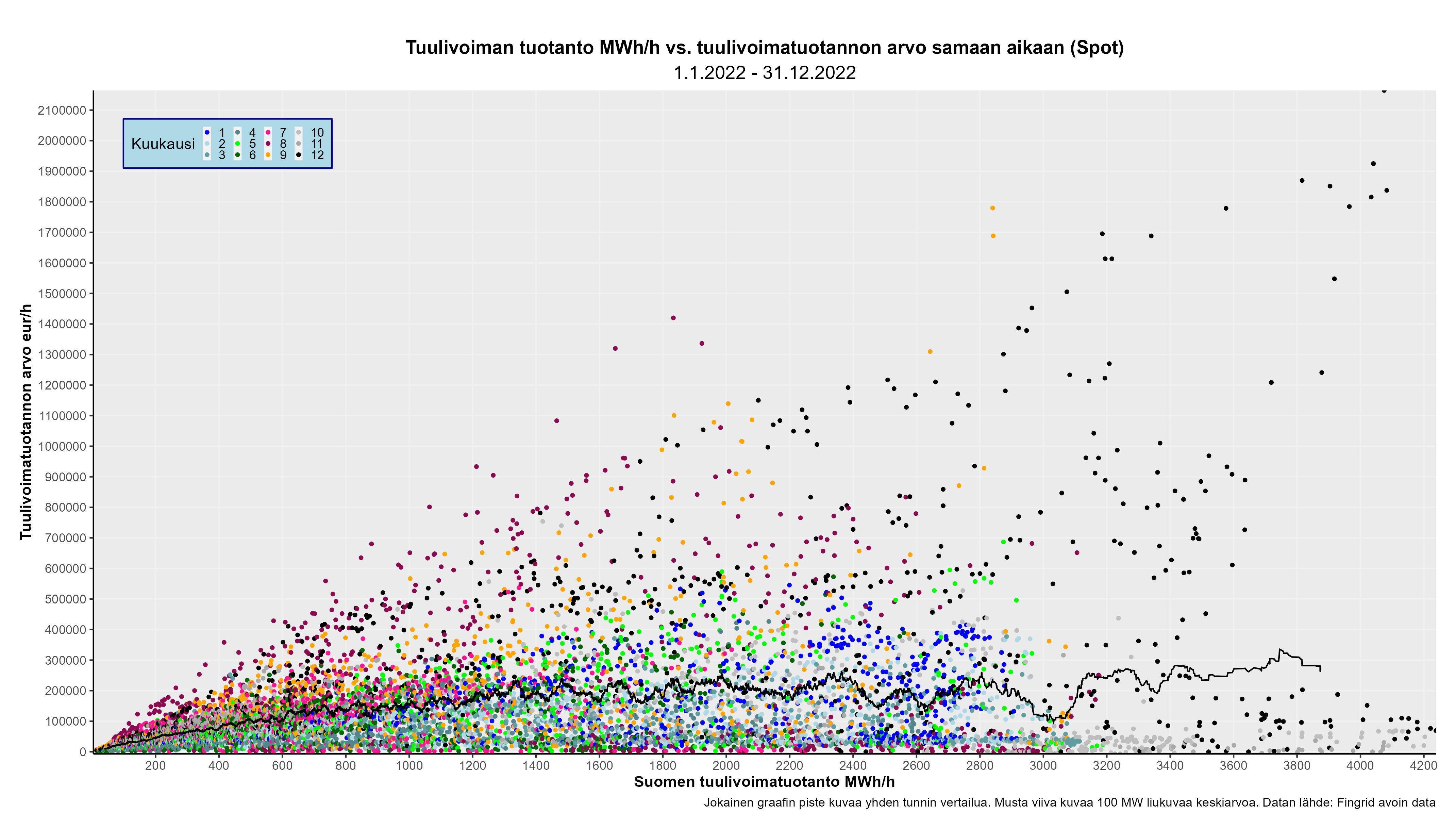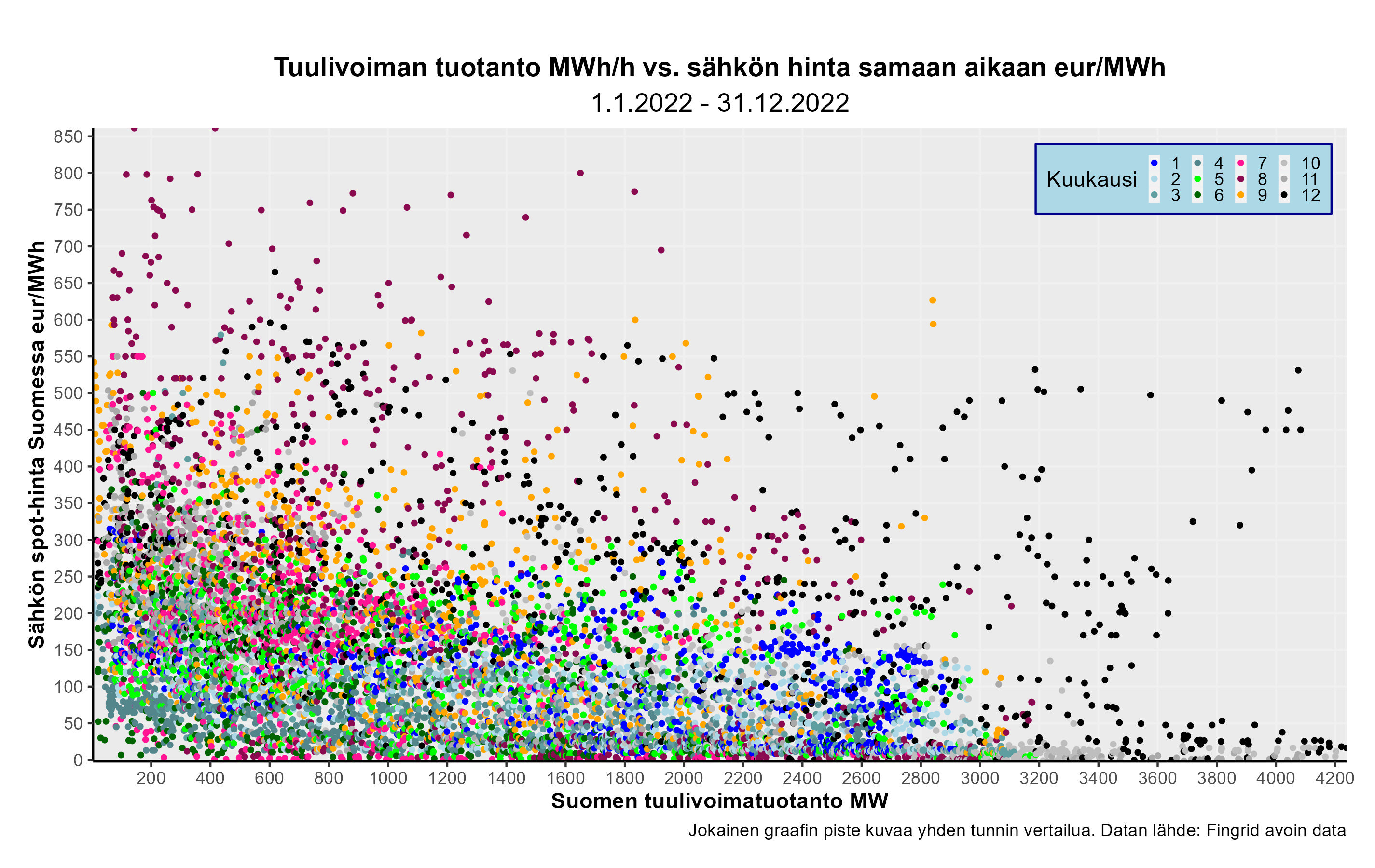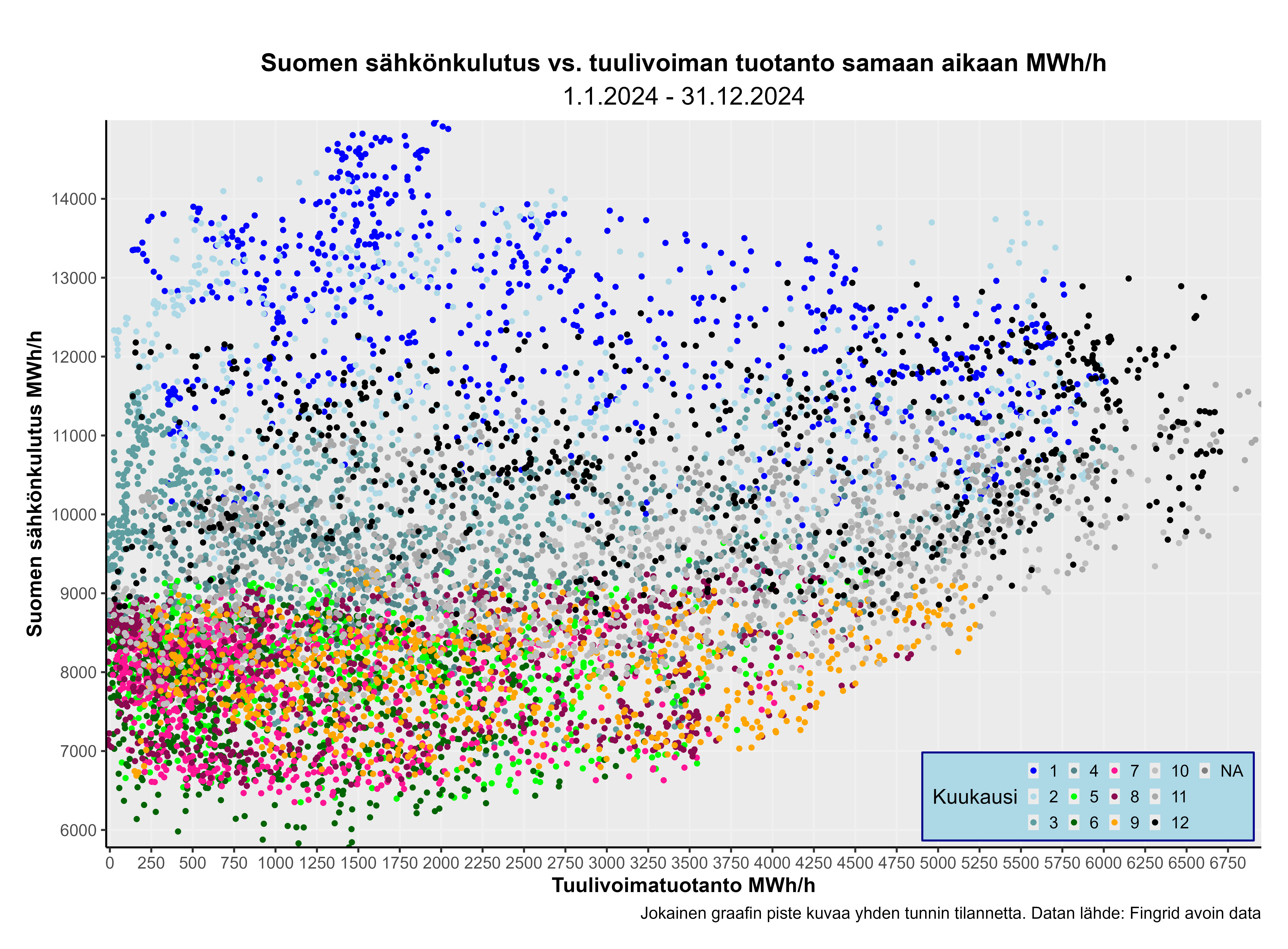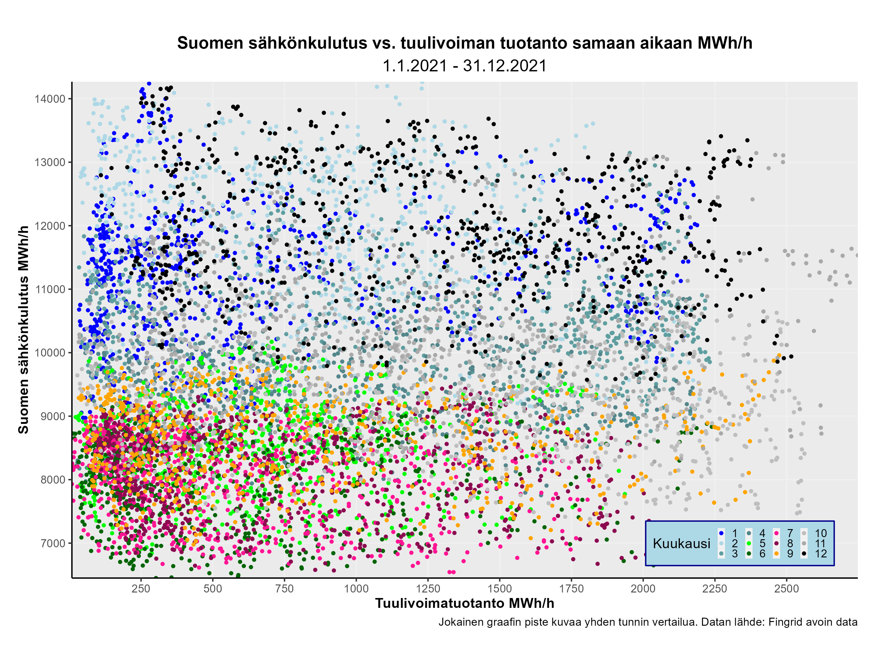 Oheisesta graafia varten on ladattu Fingridin avoimesta datasta tuntikohtainen data Suomen sähköntuotannosta ja tuulisähkön tuotannosta ajalta 1.1.2021 – 12.12.2021. Scatterplot esittää pystyakselilla Suomen sähkön tarvetta MWh/h ja vaaka-akselilla tuulivoiman tuotantoa MWh/h. Jokainen yksittäinen piste esittää yhtä tuntia tältä ajalta. Graafin värikoodaus kuvaa mille kuukaudelle kyseinen tunti osuu.