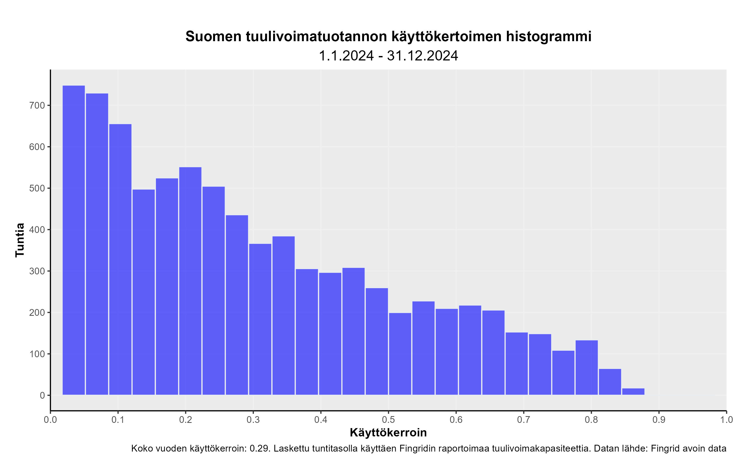Seuraavaa kuva esittää Suomen tuulivoimantuotannon käyttökertoimen histogrammia vuoden 2022 ajalta. Histogrammista näkee miten suuri osa tunneista osuu alhaisille käyttökertoimille.
