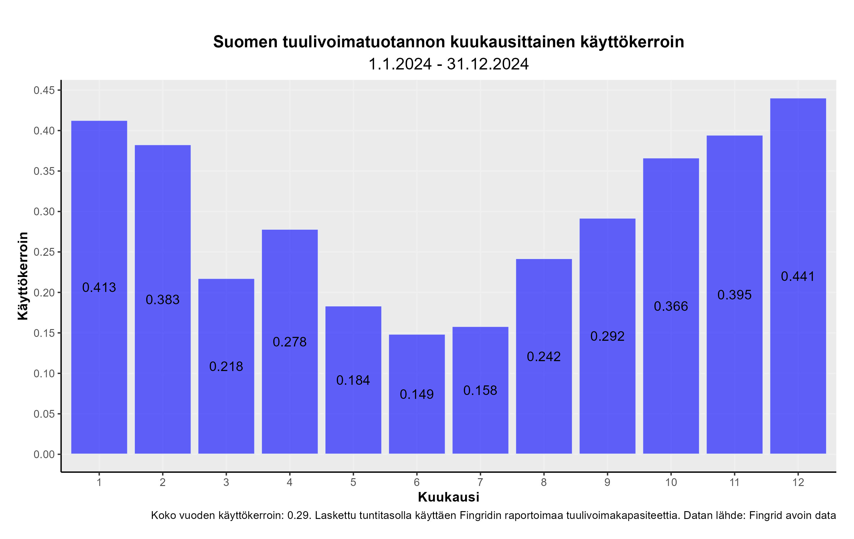 Kuukausitason käyttökerroingraafi seuraavana. Kuvasta näkee hyvin, että tuulivoima tuottaa keskimäärin enemmän talvella kuin kesällä. Kuitenkin kuten aikaisemmasta tuntitason tarkastelusta nähdään, ei kuukausitason tuotanto takaa mitenkään parempaa vastaavuutta tuotannon kanssa tuntitasolla.
